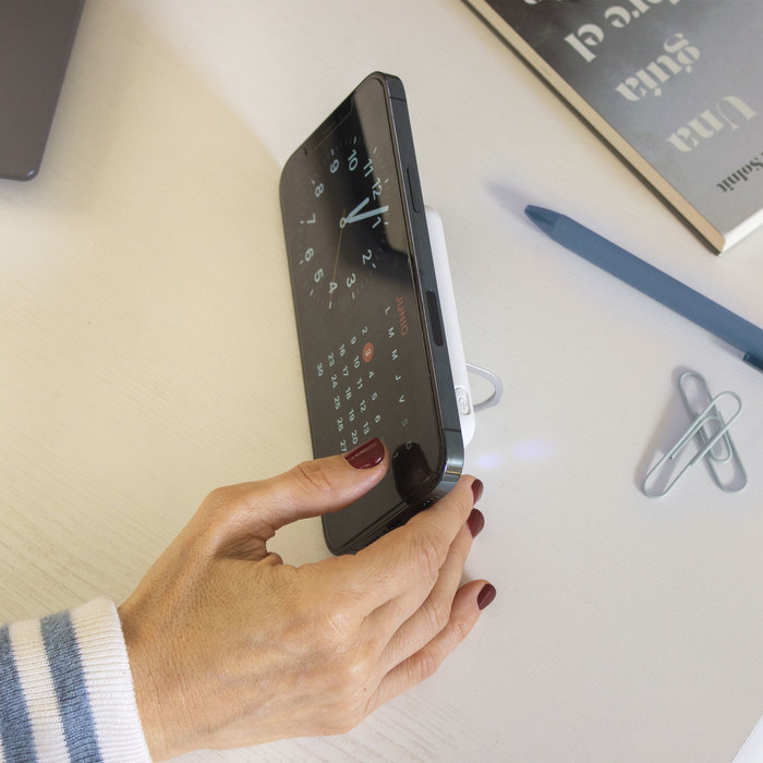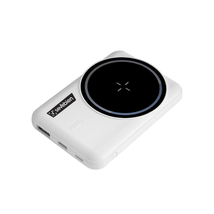 Power bank inalámbrico con aro magnético y soporte de anillo. Color blanco mate y negro brillante. Posee Entrada y salida: 5V 2A. Con 2 puertos de carga USB-C y micro USB. Función inalámbrica magnética. Potencia inalámbrica: 5W. Indicador luz led de carga. Soporte plateado rebatible al dorso. Cable de carga USB-C de 30 cm. en color blanco.
