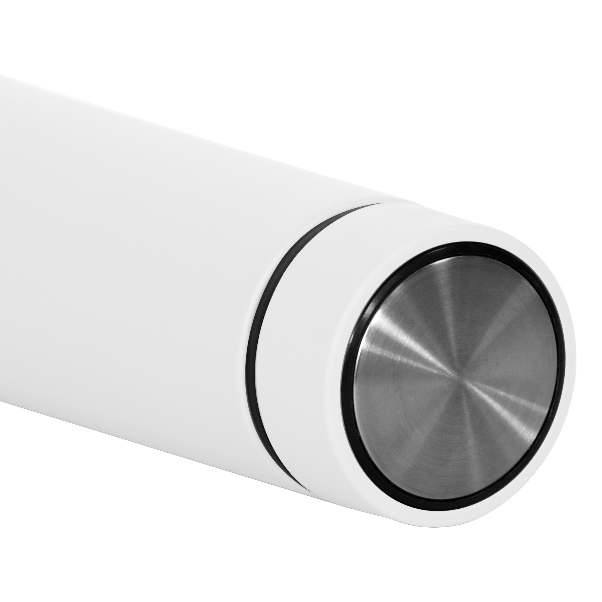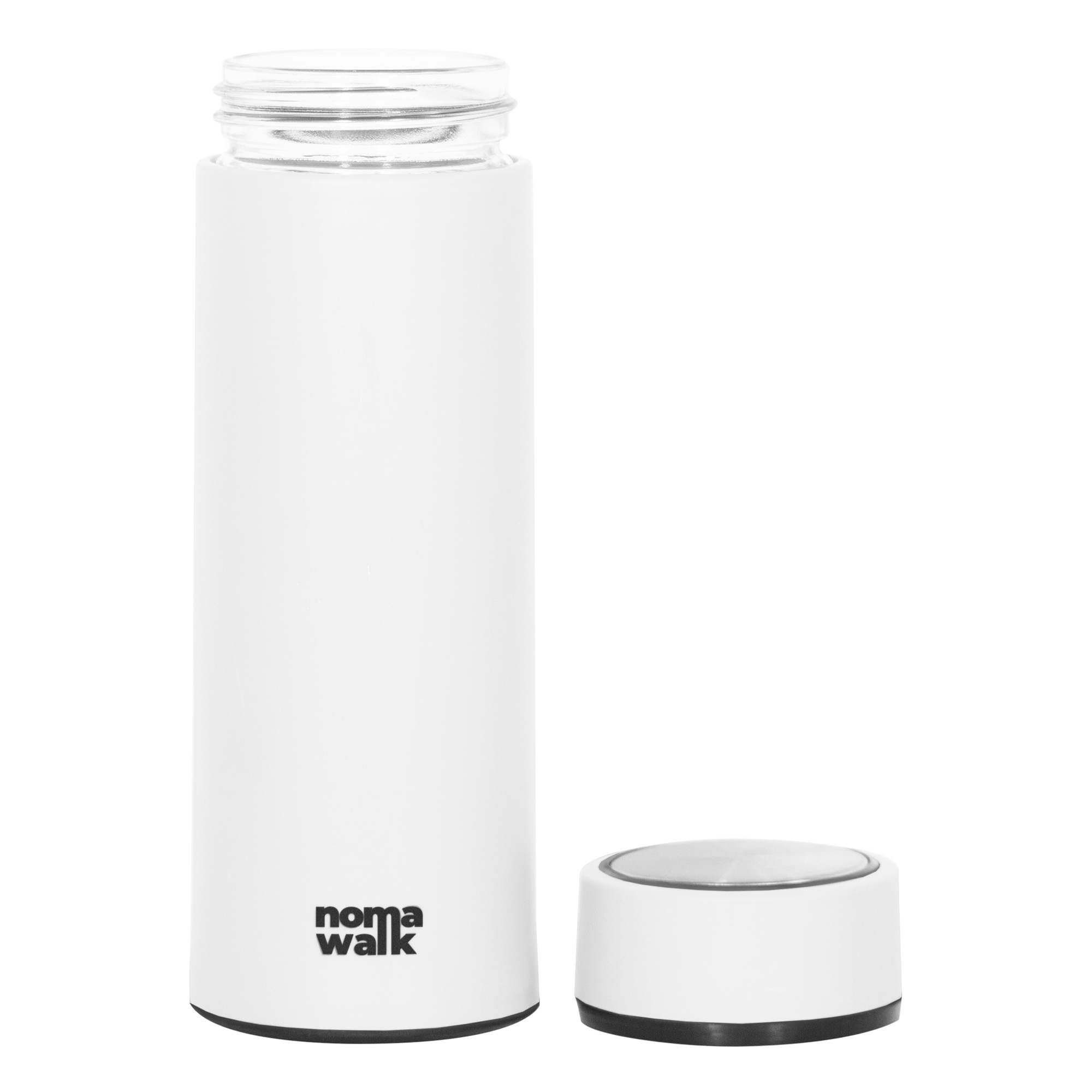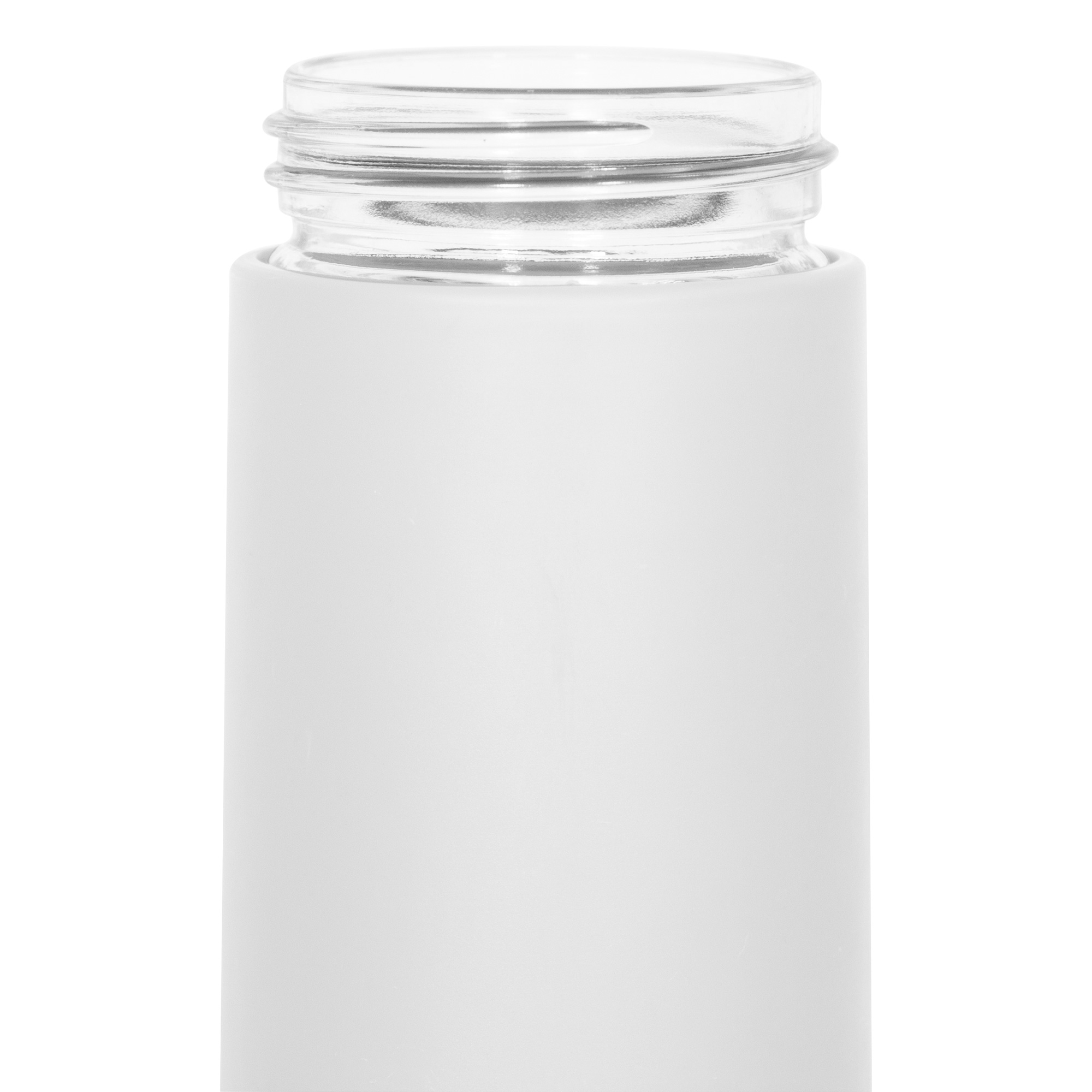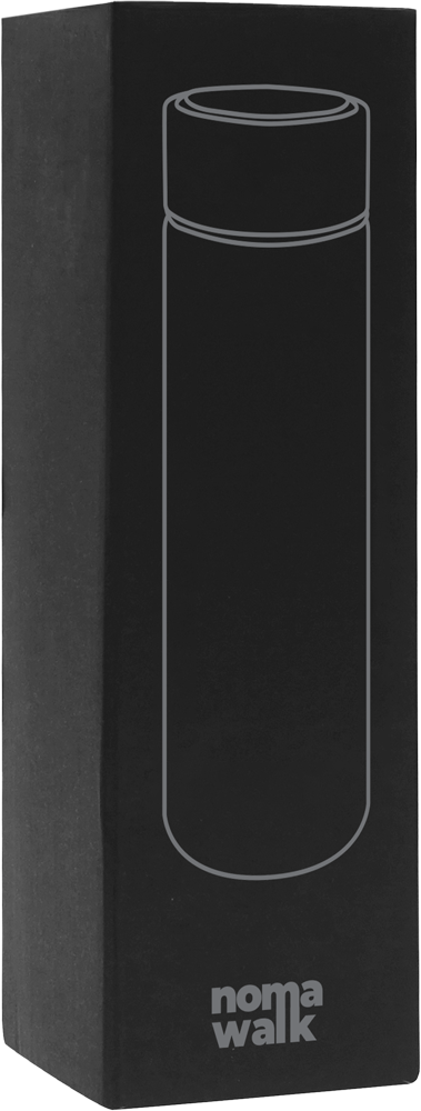 Ø 7 x 19 cm. Capacidad 450 ml. Vidrio y polipropileno. Botella de vidrio con recubrimiento plástico. Tapa a rosca con detalles metálicos y logo grabado. Presentación en caja de regalo.