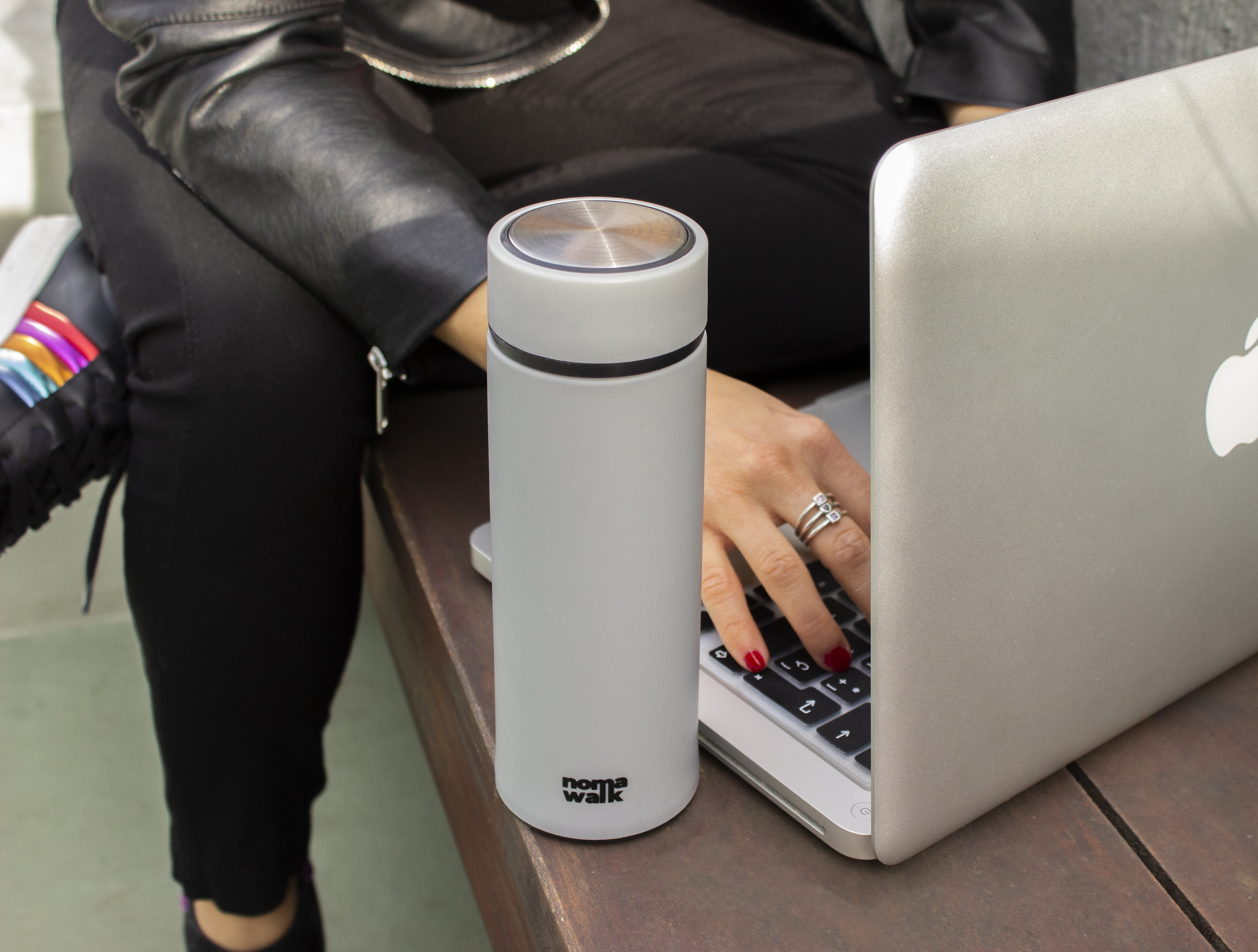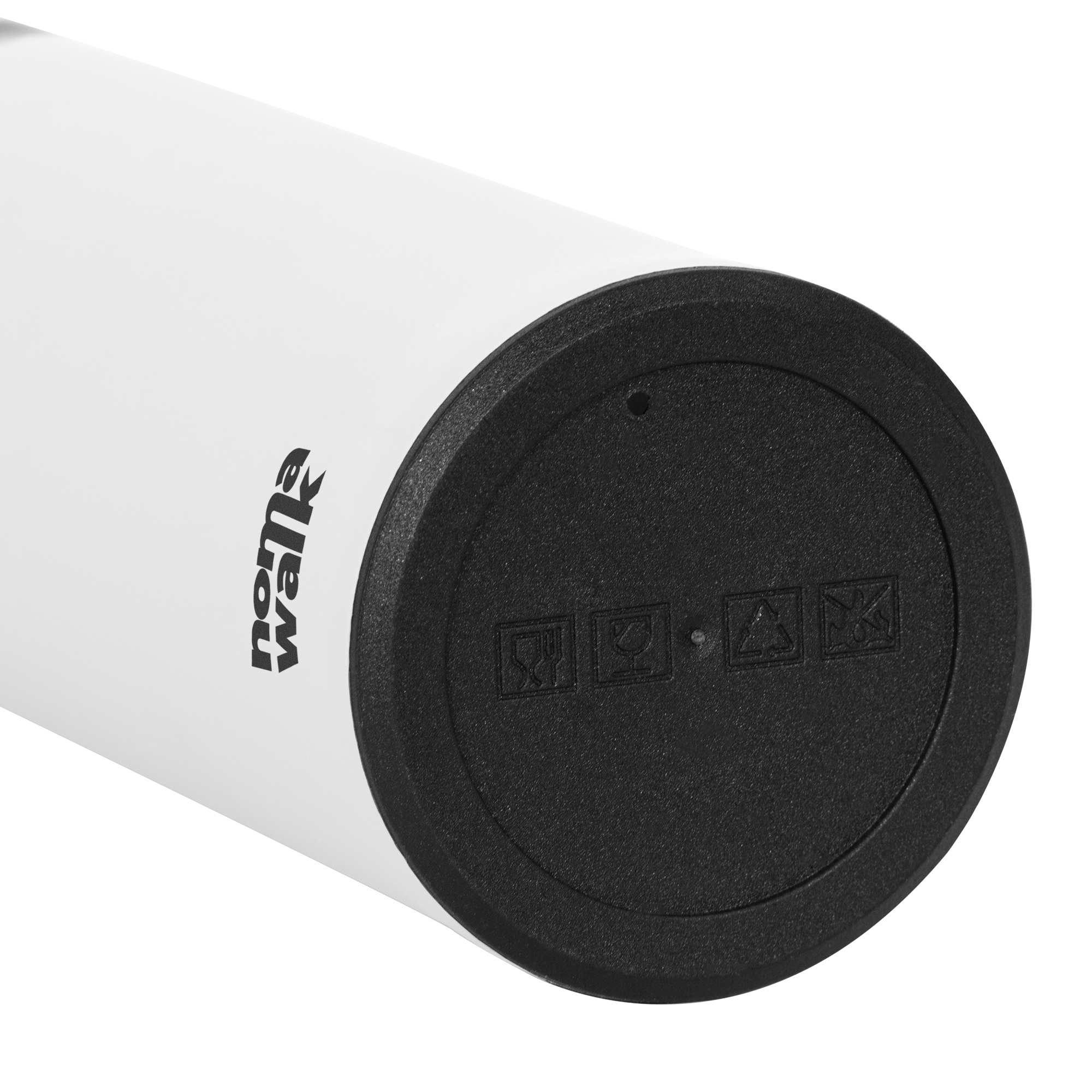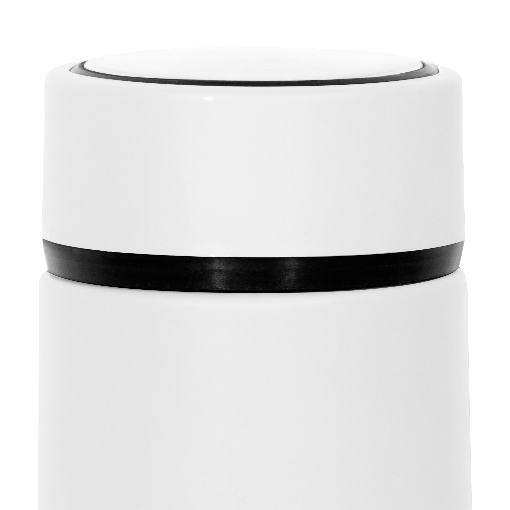 Ø 7 x 19 cm. Capacidad 450 ml. Vidrio y polipropileno. Botella de vidrio con recubrimiento plástico. Tapa a rosca con detalles metálicos y logo grabado. Presentación en caja de regalo.