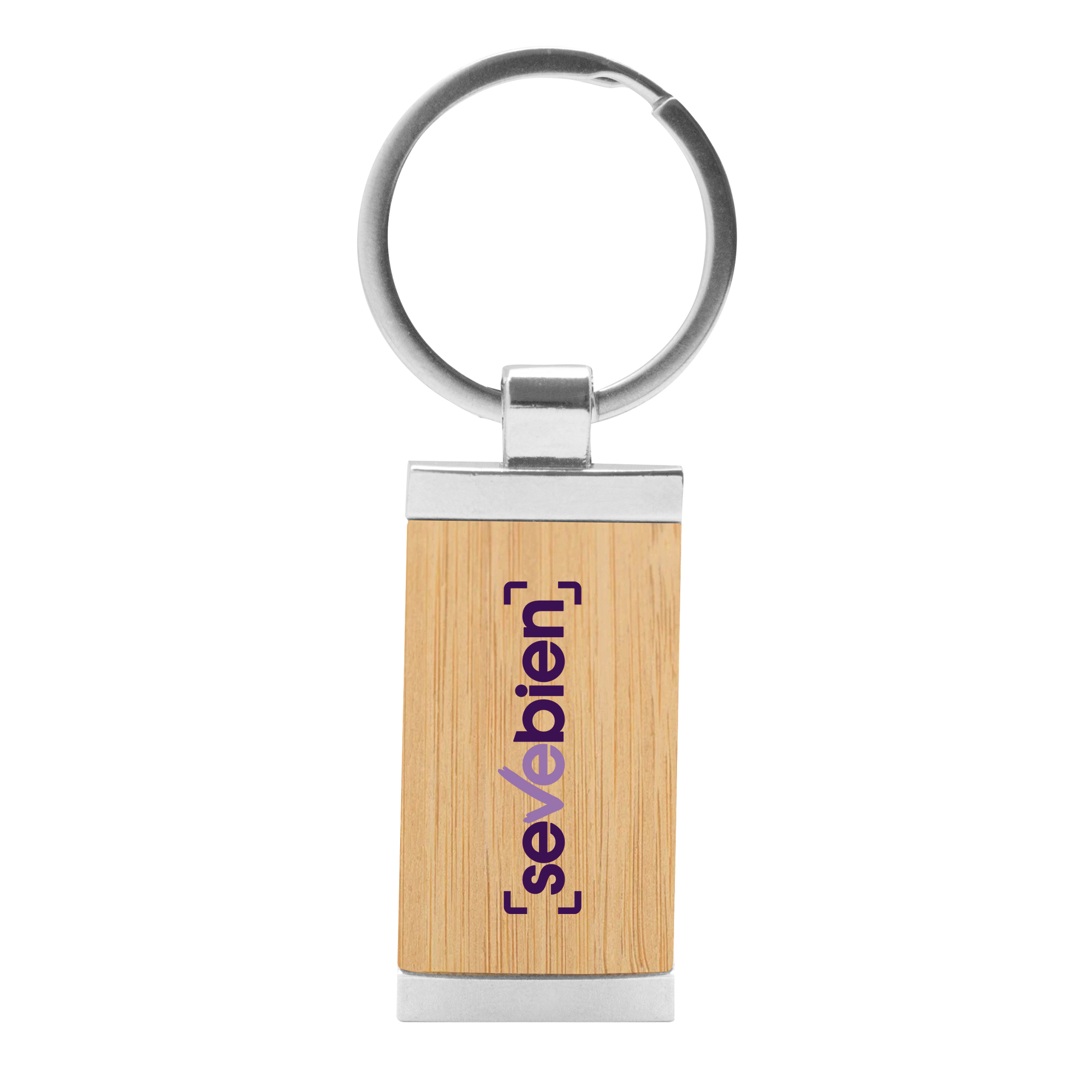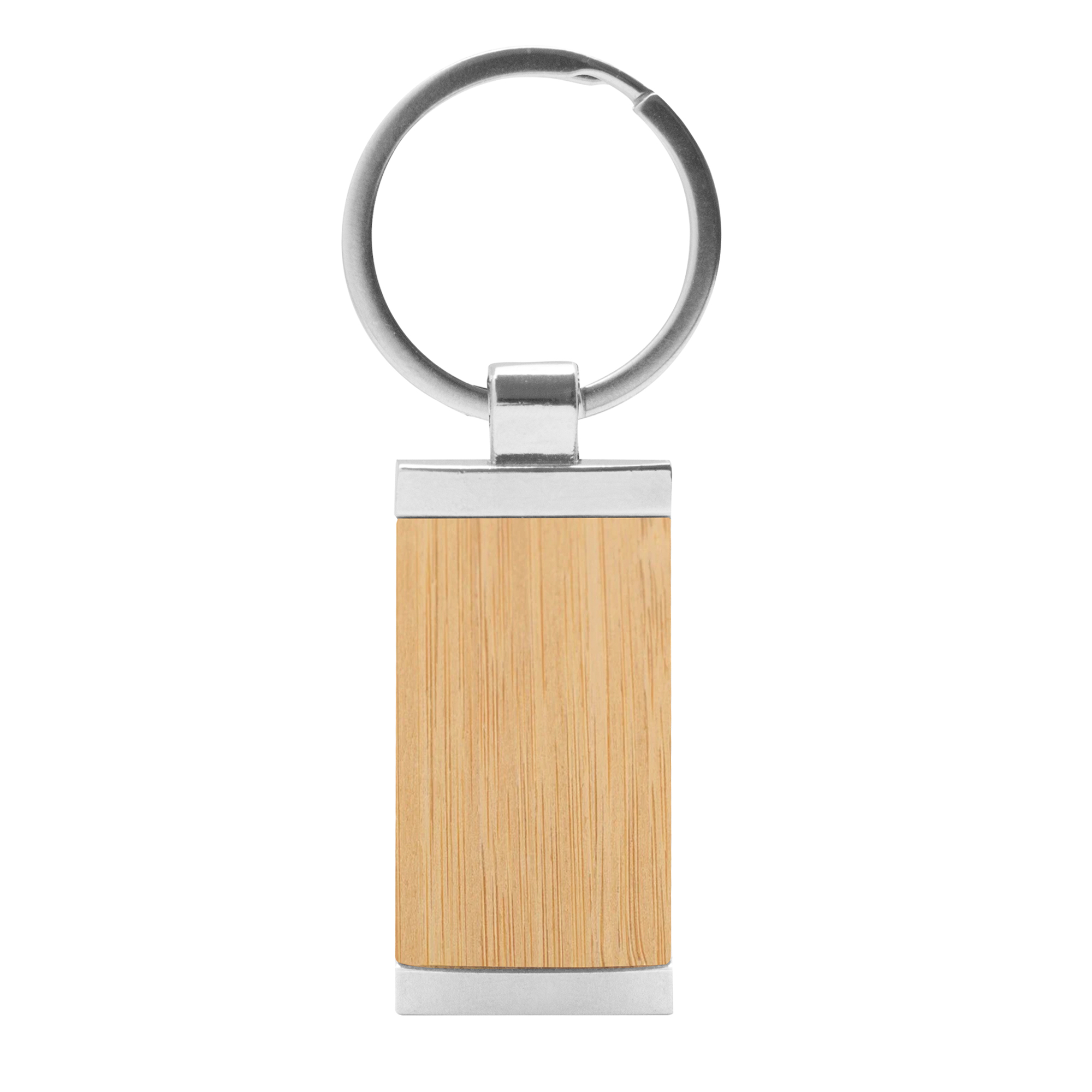 8,5 x 2,4 x 0,6 cm. Llavero rectangular de bambú con detalles metálicos. Presentación en caja de regalo.