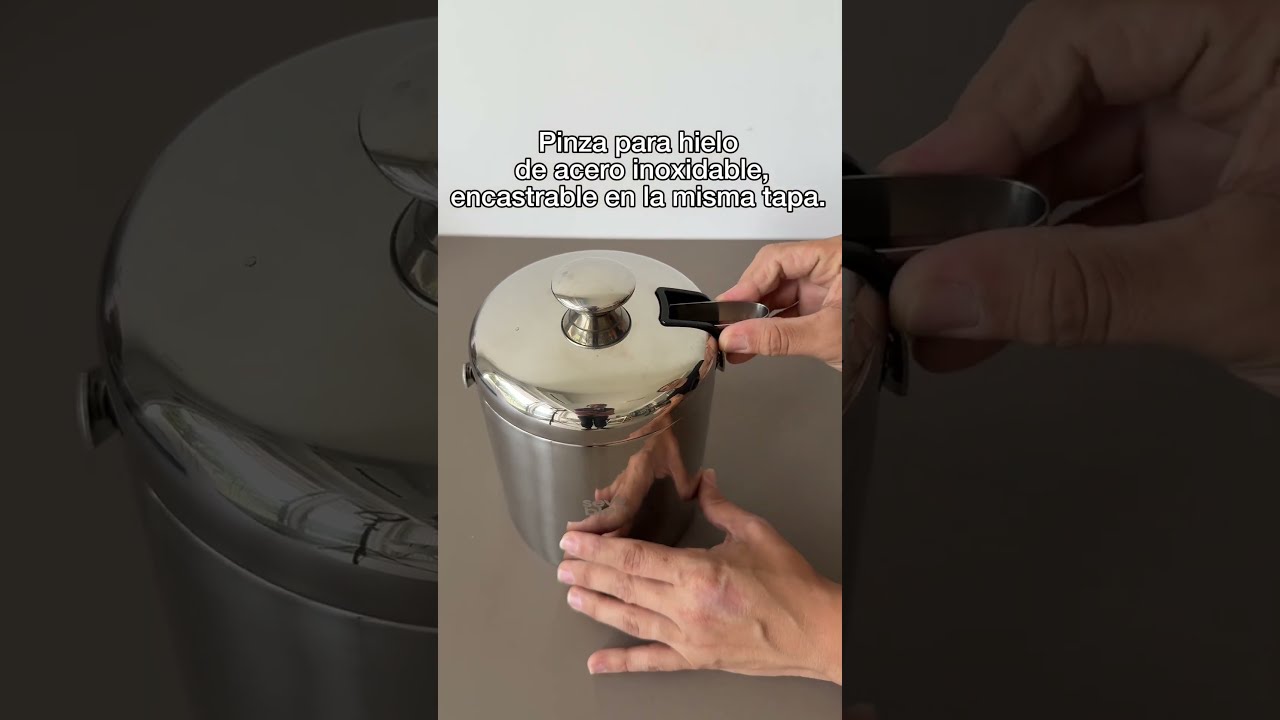 Ø 14 x 14 cm. Capacidad 1100 ml. Acero inoxidable. Interior en acero 304 y exterior en acero 201. Hielera de mesa con tapa. Pinza para hielo de acero inoxidable, encastrable en la misma tapa. Asa de acero inoxidable para transportar. Presentación en caja de regalo kraft.