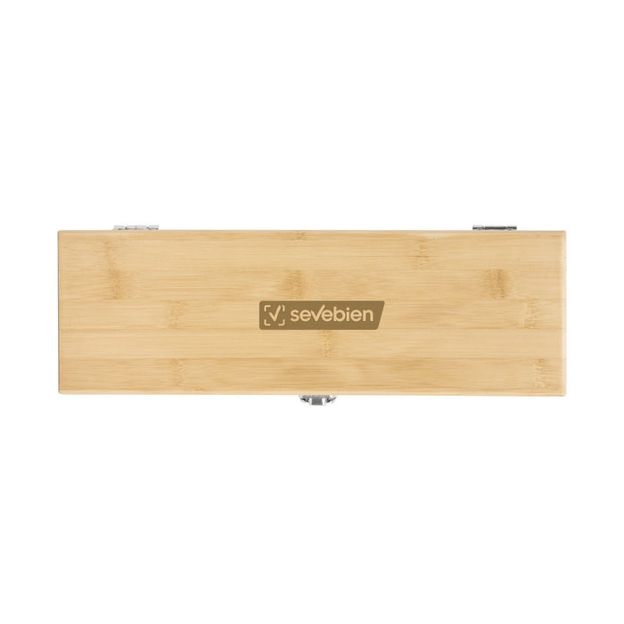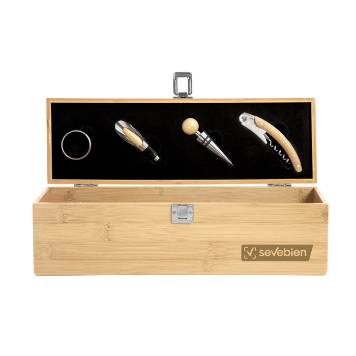 Set de vino. Caja de bambú portabotellas con cierre metálico. Bandeja de eva con set de 4 accesorios: sacacorchos, anillo antigoteo, tapón y vertedor.
